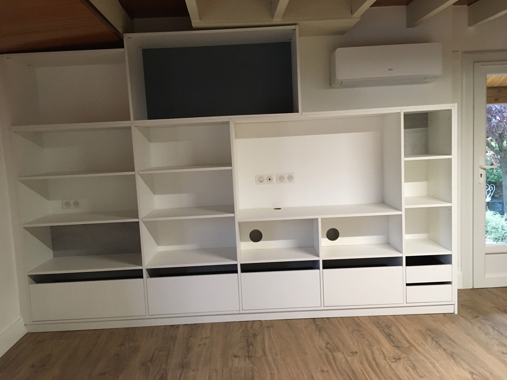 La cheminée imposante a laissé place à un meuble télé sur mesure adapté aux besoins de nos clients (coin TV, espace livres, espace multimédia, tiroirs,...) ainsi qu'aux différentes contraintes techniques de la pièce (différence de hauteur de plafond, poutre et climatiseur)