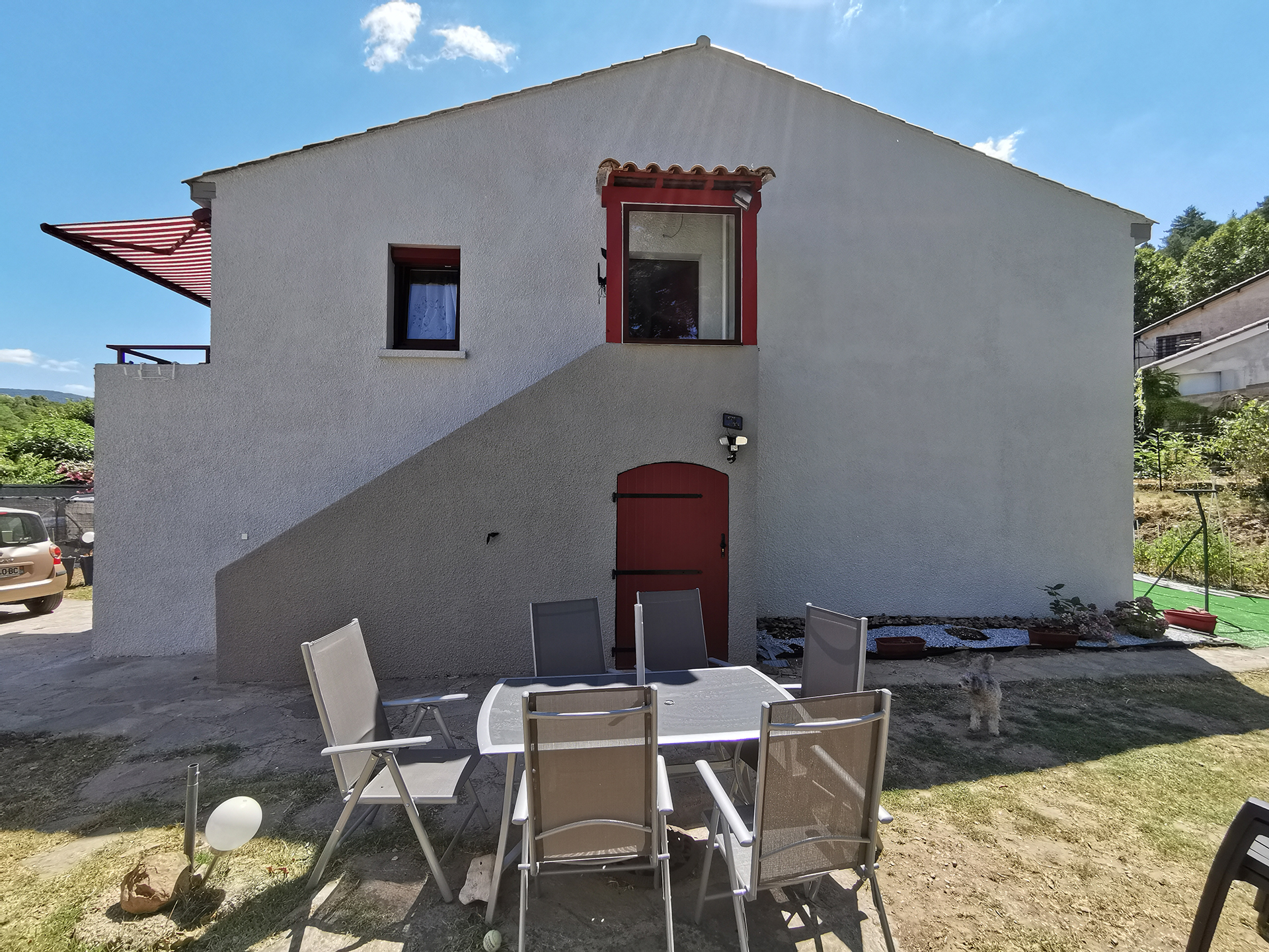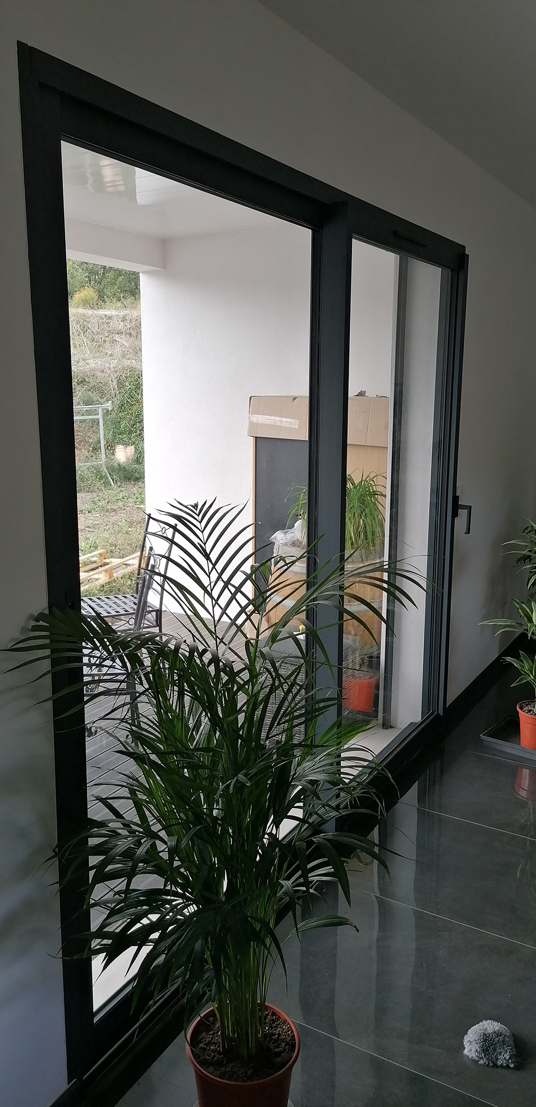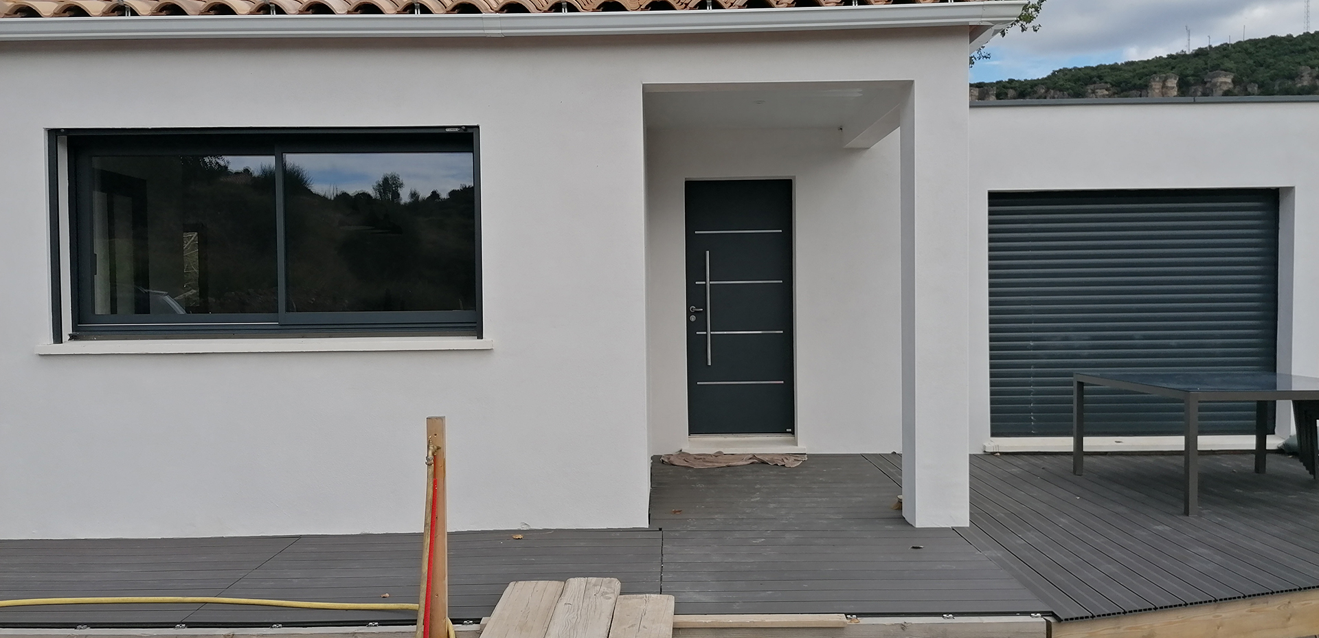 Maisons neuves — Porte d'entrée — Vue extérieure Maisons neuves — Porte d'entrée — Vue intérieure Maisons neuves — Fenêtre vitrée donnant sur la terrasse vue intérieure Maisons neuves — Vue d'ensemble
