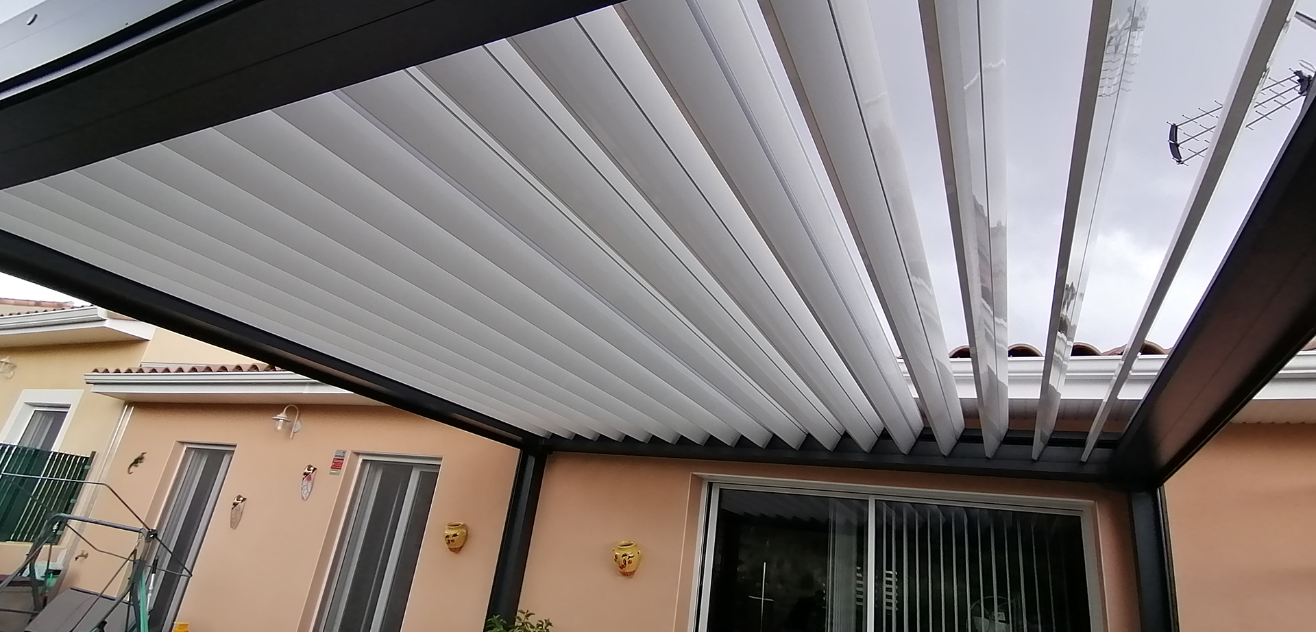 Pergolas et Stores - Store de toit ouvert Pergolas et Stores - Store de toit fermé Pergolas et Stores - Store de toit entre-ouvert - Vue de face