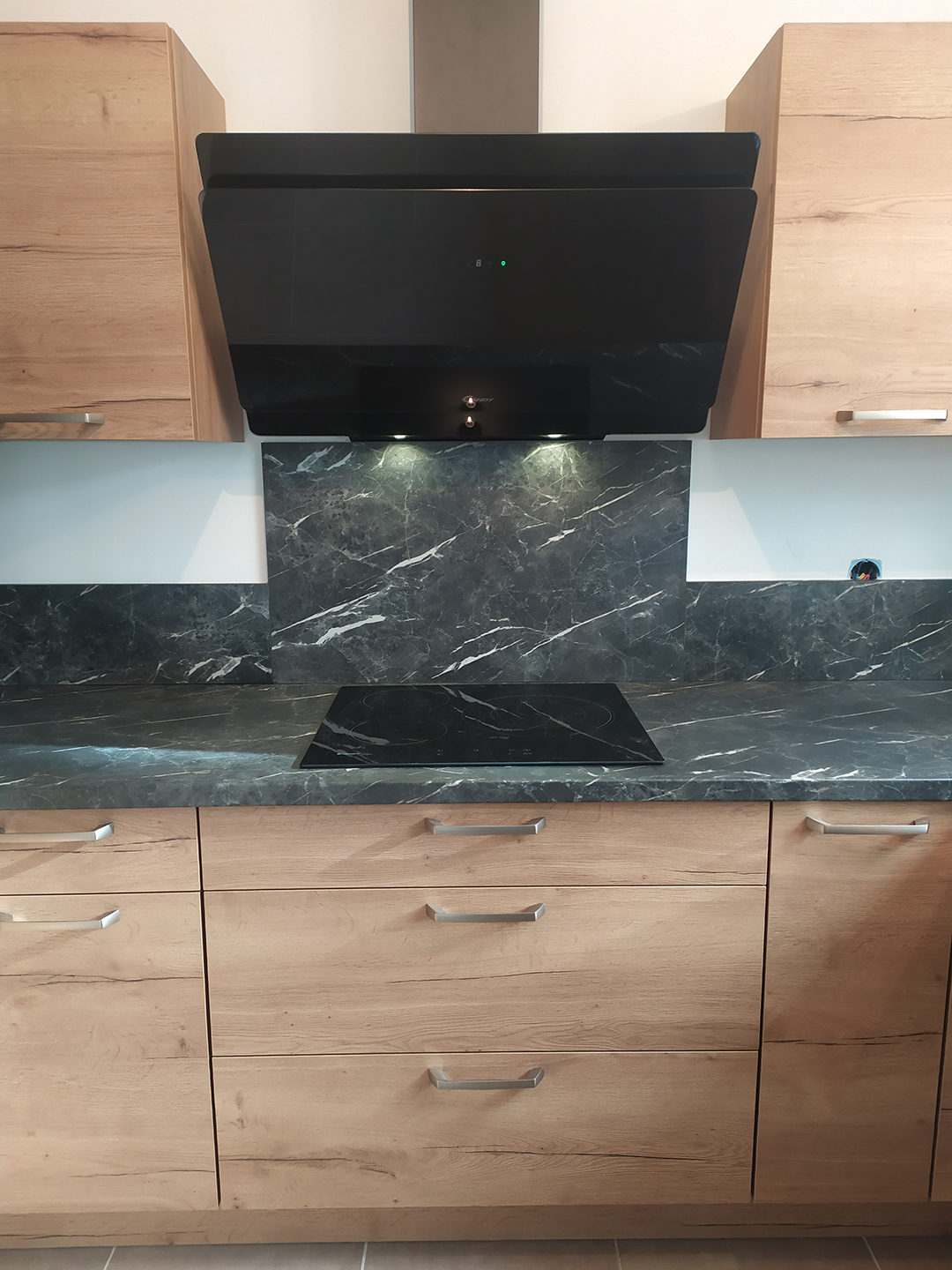 Cette cuisine a été pensée pour gagner en fonctionnalité et en rangement, l’élégance du bois associé à un plan de travail effet marbre donne un côté chaleureux à cette pièce.