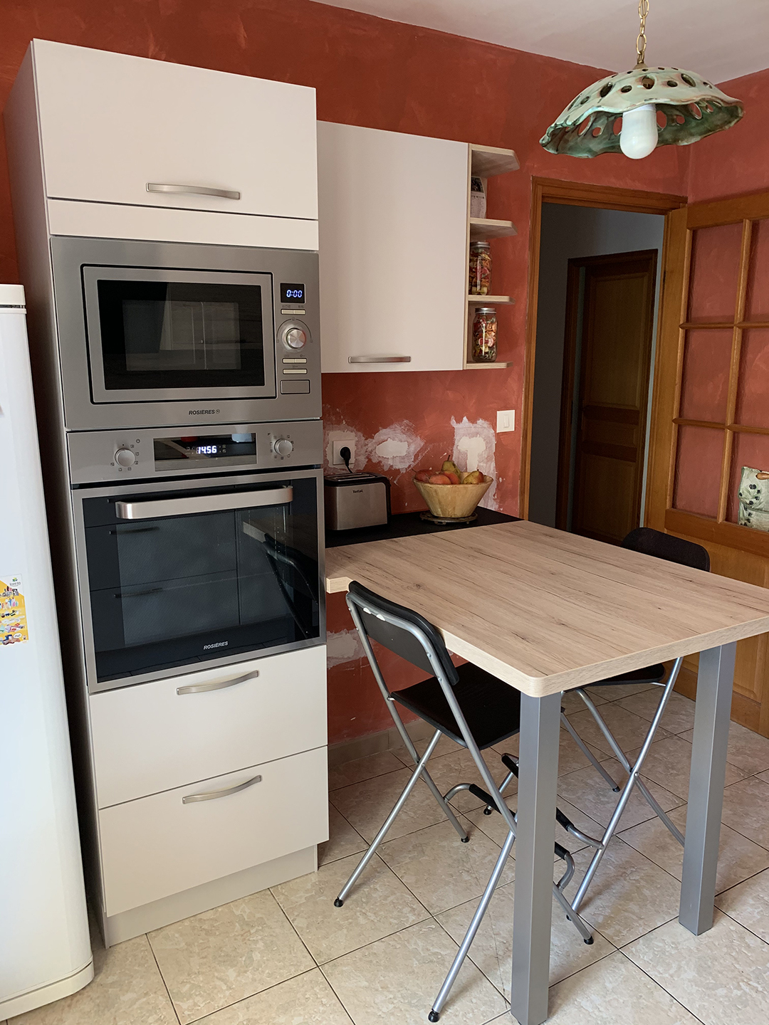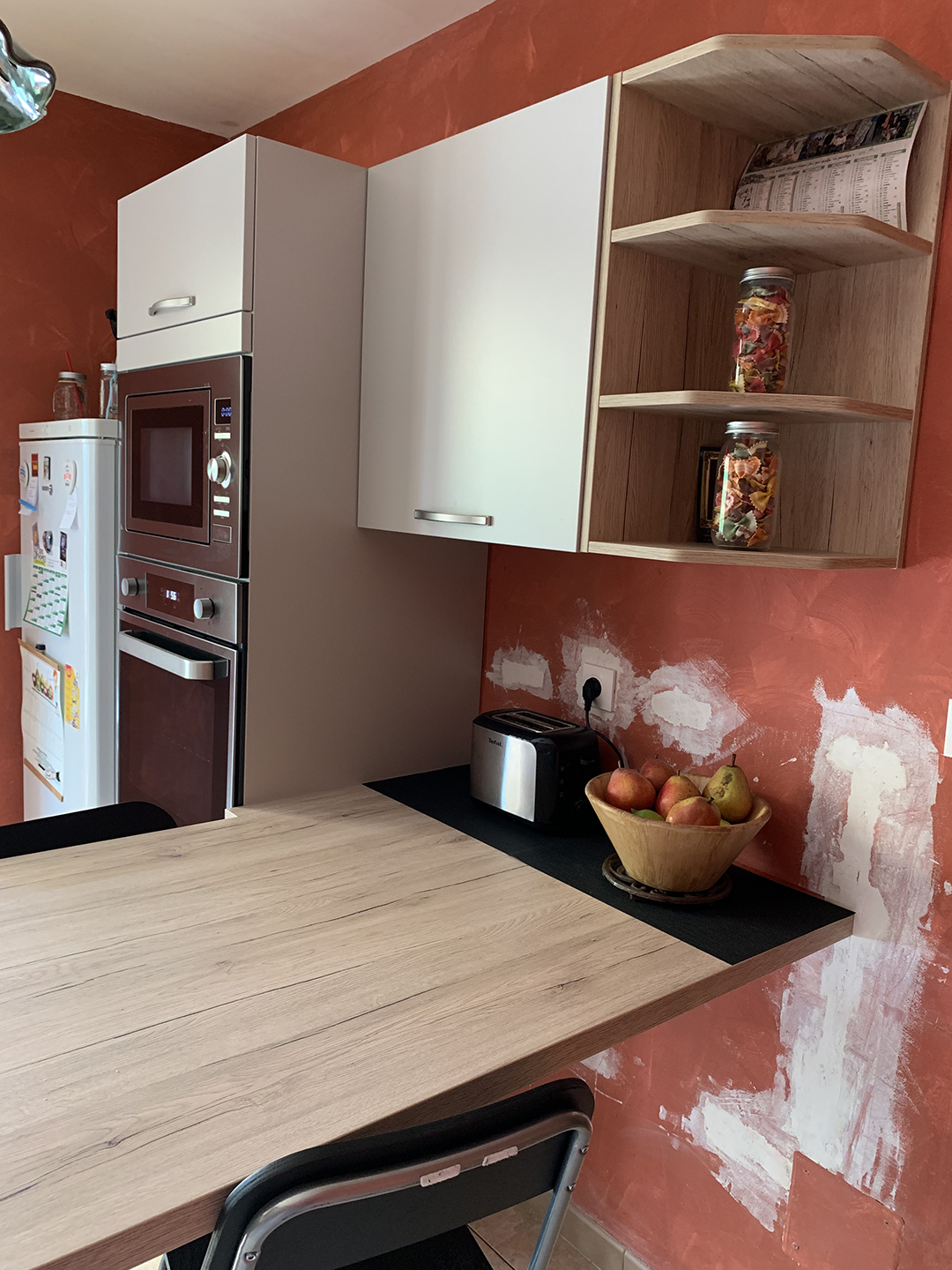 Rénovation d'une cuisine, l'enjeu étant de la rendre plus fonctionnelle avec plus de rangements en conservant un espace repas.